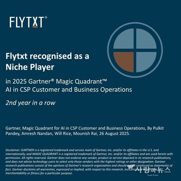아랍에미리트, 두바이, 2025년 9월 30일 -- 통신•구독 기반 비즈니스용 엔터프라이즈 인공지능(AI) 선도기업 플라이텍스트(Flytxt)가 가트너(Gartner)가 발표한 2025 매직 쿼드런트(Magic Quadrant 2025) '통신서비스제공업체(CSP) 고객•비즈니스 운영용 AI 부문'에서 니치 플레이어(Niche Player)로 2년 연속 선정되는 영예를 안았다. 플라이텍스트 AI는 수조 건의 실제 데이터를 바탕으로 대규모로 훈련받은 모델로, CSP가 영업•마케팅, 제품•가격 책정, 고객 관리 전반에서 영향력 있는 의사 결정과 실행을 주도할 수 있게 특별히 설계됐다.