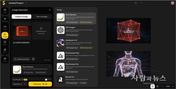 이번에 업그레이드된 스카이릴스에서는 모든 AI 기능과 세계 최고의 AI 모델이 단일 창작 작업 공간에 완벽하게 통합되었다. 하나의 캔버스가 통합형 AI 도구 역할을 하여 이미지, 동영상, 음악, 기타 멀티모달 콘텐츠를 손쉽게 병합할 수 있다.