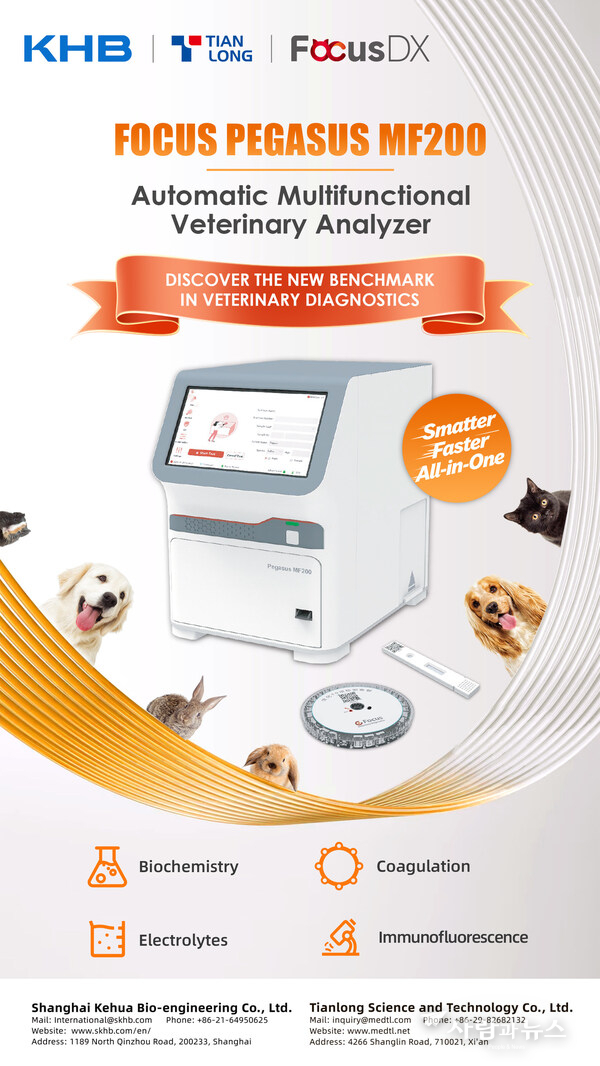 사람과뉴스 전재은 기자 | 시안, 중국 2025년 11월 14일 -- KHB 그룹의 자회사이자 수의 현장 진단(POCT) 솔루션 혁신 기업인 광저우 포커스 바이오테크놀로지(Guangzhou Focus Biotechnology Co., Ltd.)가 자동 다기능 수의학 분석기 'FOCUS PEGASUS MF200' 업그레이드 버전을 선보였다. MF200은 수의 진단 분야에서 효율성, 신뢰성, 접근성을 새롭게 정의하는 차세대 시스템이다.