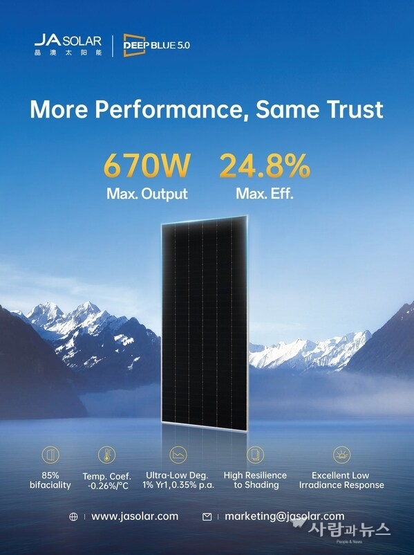 사람과뉴스 박명오 기자 | 베이징 2026년 1월 26일 -- 신뢰받는 글로벌 녹색 에너지 파트너인 JA 솔라(JA Solar)가 유틸리티, 상업 및 산업용(C&I), 주거용 시장 전반에 걸쳐 DeepBlue 5.0 모듈의 글로벌 공급을 빠르게 확대하고 있다. 이는 최근 변동성이 커진 글로벌 태양광 시장에서 개발사들이 장기적인 가치, 투자 신뢰성 및 리스크 완화를 점차 중요하게 고려하고 있는 추세를 반영한 것이다.