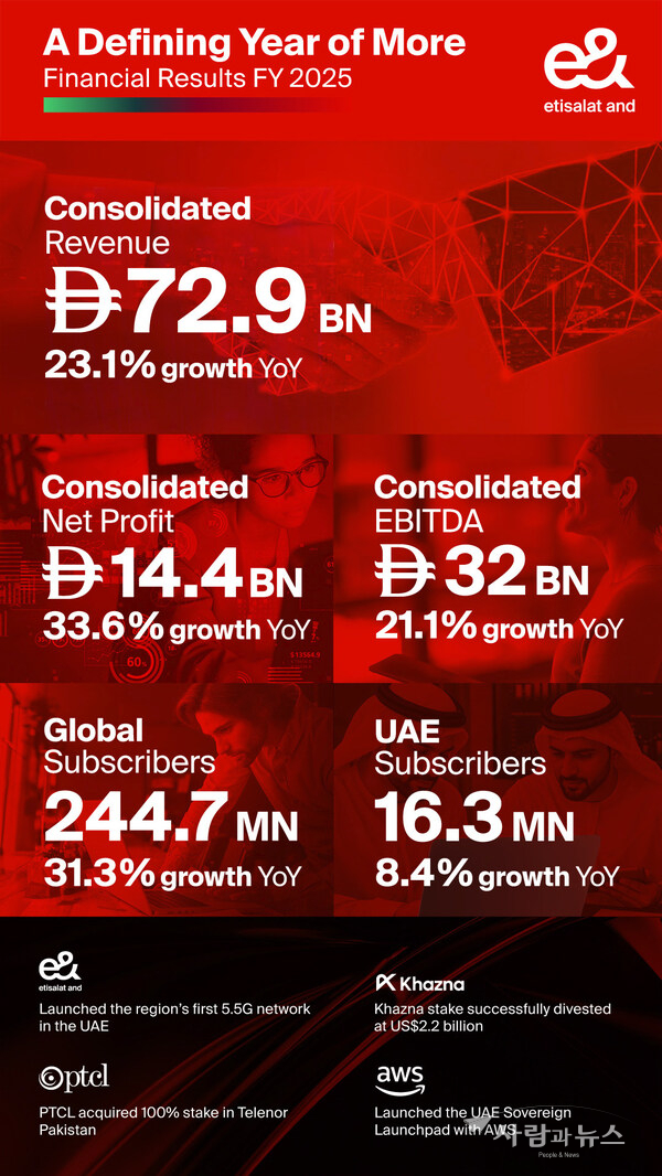 아부다비, 아랍에미리트, 2026년 2월 25일 -- 이앤드(e&)가 2025년 사상 최대 실적을 달성하며 전년 대비 23.1% 증가한 수치인 연결 매출 729억 디르함을 기록했다고 발표했다.