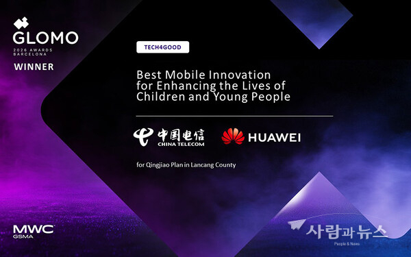 사람과뉴스 박명오 기자 | 바르셀로나, 스페인 2026년 3월 11일 -- 화웨이(Huawei)와 차이나텔레콤(China Telecom)이 중국 란창현에서 진행 중인 칭자오 플랜(Qingjiao Plan)의 프로젝트로 MWC 2026 바르셀로나(MWC 2026 Barcelona)에서 열린 GSMA 글로모(GSMA GLOMO) 시상식에서 테크포굿(Tech4Good) 부문 어린이와 청소년의 삶 개선을 위한 최우수 모바일 혁신(Best Mobile Innovation for Enhancing the Lives of Children and Young People) 상을 받았다.