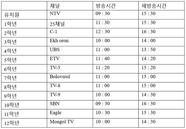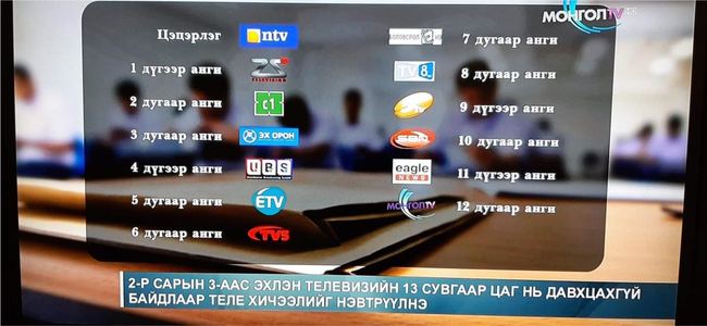 7학년 수업은 “Bolovsrol(교육방송)” 채널에서 11시에 방송되어 15시에 재방송된다. 8학년 수업은 “TV-8” 채널에서 11시에 방송되어 15시에 재방송된다.