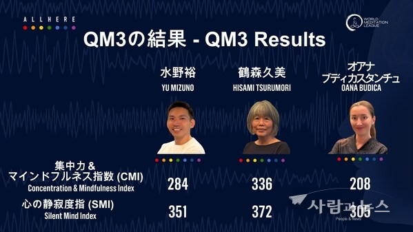 챌린지 참가자인 오아나 부디카스탄쿠(Oana Budicastancu), 츠루모리 히사미(Hisami Tsurumori), 미즈노 유(Yu Mizuno)씨 중 츠루모리씨가 가장 높은 QM3™ 점수를 기록했다. 그녀는 "20년 전 질병에 걸린 일을 계기로 명상을 시작한 뒤 매일 수행해왔다"면서 "삶에서 스트레스와 불안을 느끼는 분에게 명상이 내게 그랬듯 내적 평화를 가져다주길 바란다"고 전했다.