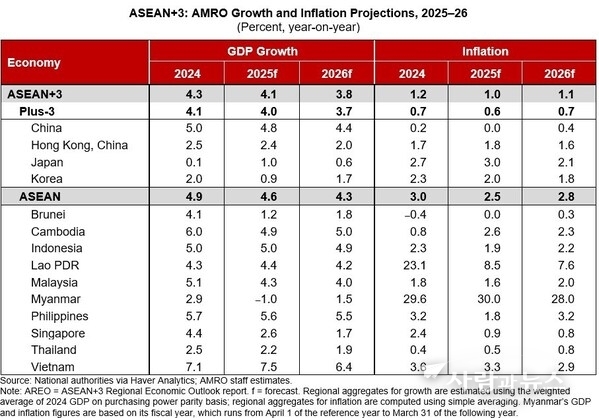 아세안+3 지역의 경제성장률은 2025년 4.1%, 2026년 3.8%로 전망되며, 이는 상반기의 견조한 성장 실적과 예상보다 강한 수출 모멘텀에 힘입어 7월 전망치에서 상향 조정된 것이다. '해방의 날 (Liberation Day)' 관세 발표 이후 4월에 정점에 달했던 시장 압력도 점차 완화되고 있다.